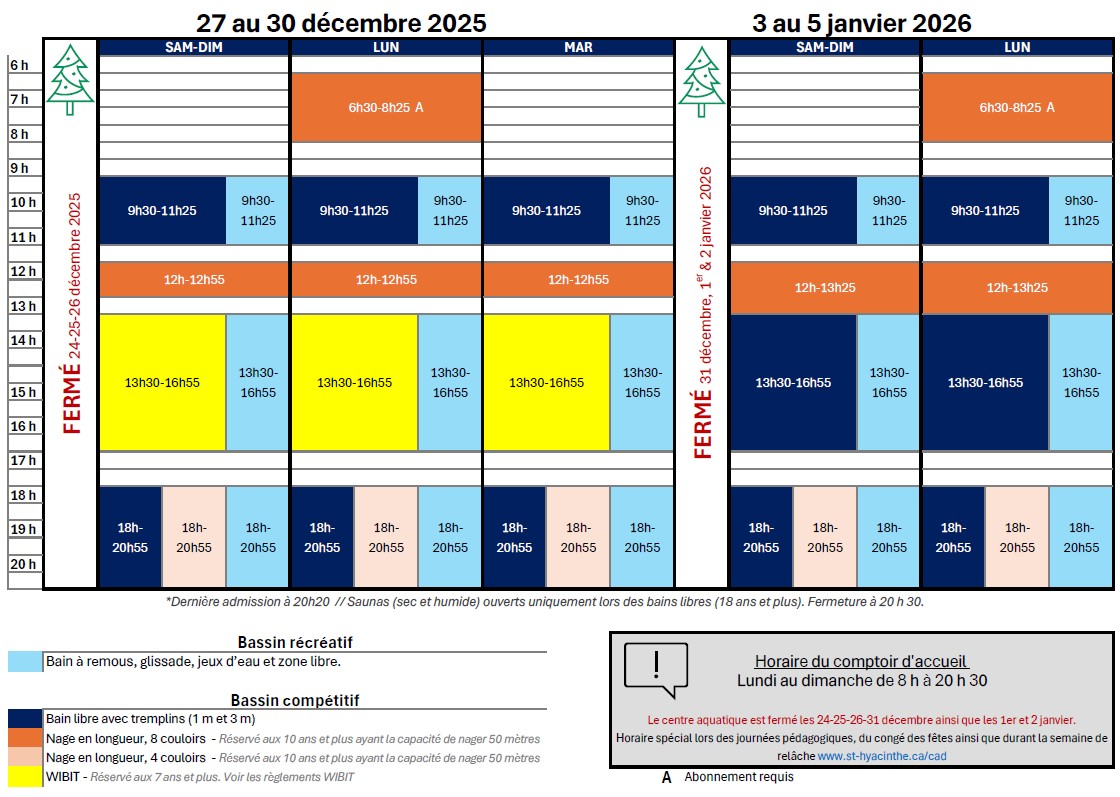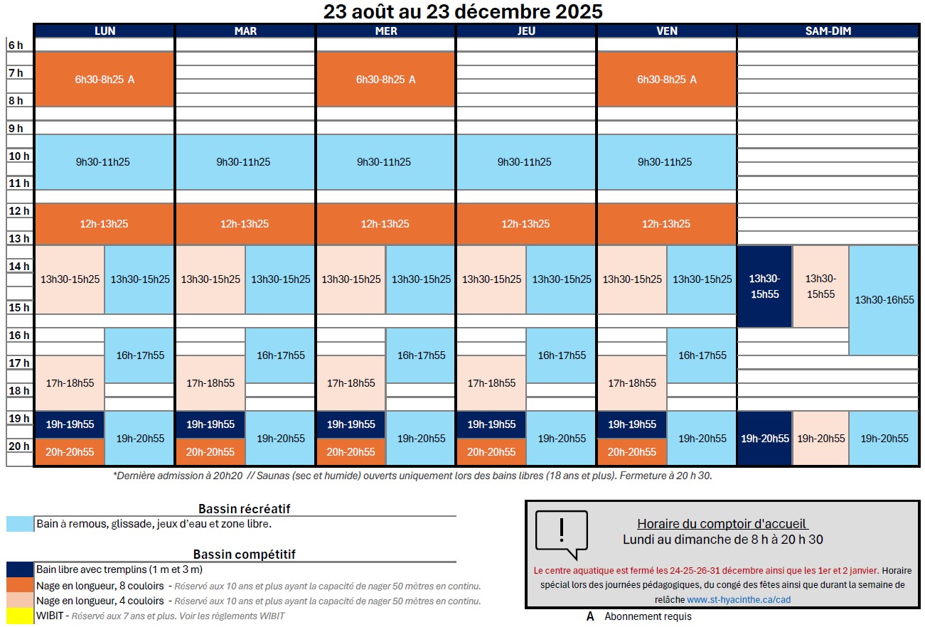 Bain libre (matin & soir) : Avant 8 h, l’abonnement est obligatoire. Après 20 h : dernier accès avant 20 h 20.