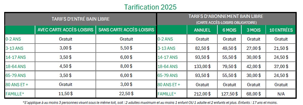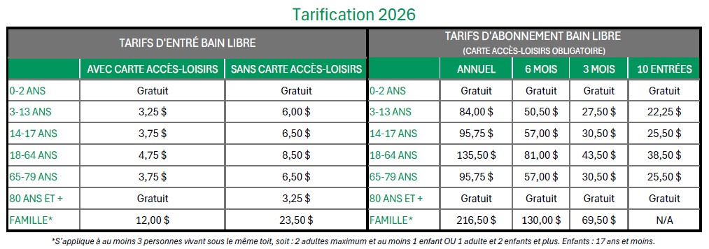 Carte Accès-Loisirs obligatoire pour accéder aux bassins lorsque vous êtes inscrits à un cours ou à un abonnement aquatique.