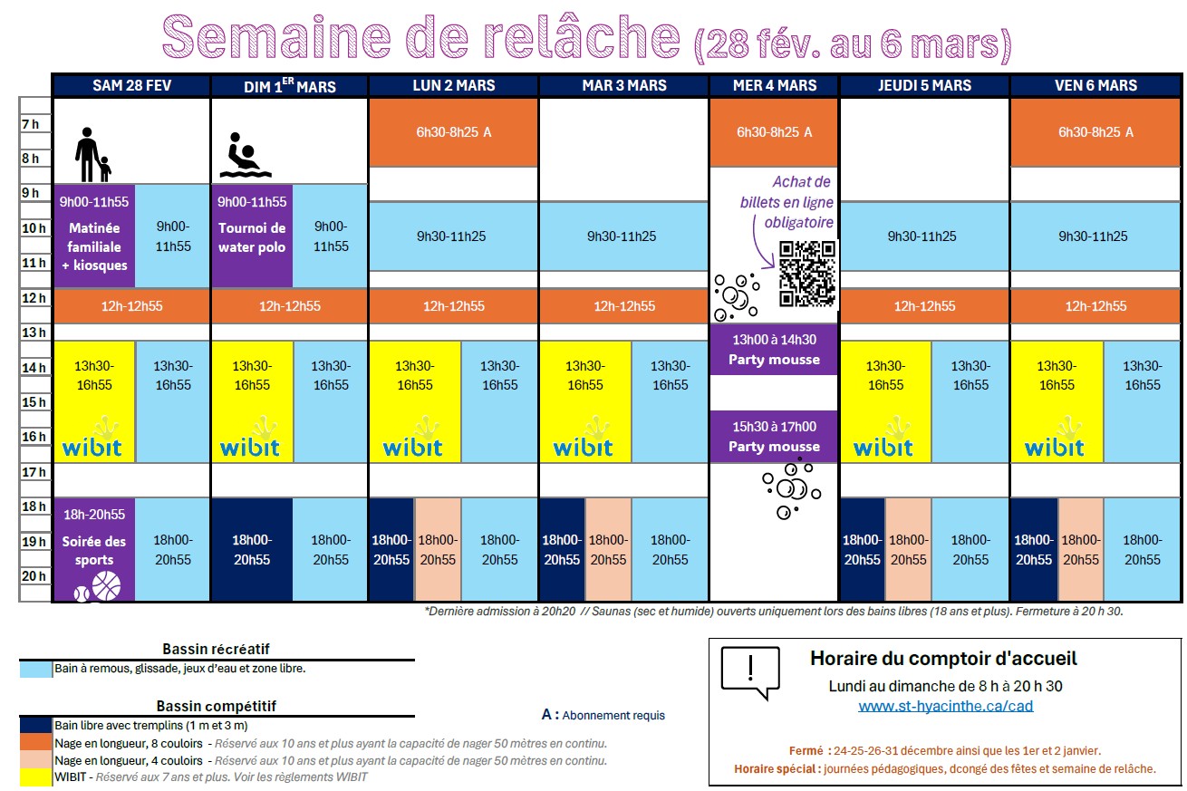 Saunas (sec et humide) : Accessible aux 18 ans et plus durant les plages de baignades libres. Fermeture à 20 h 30.