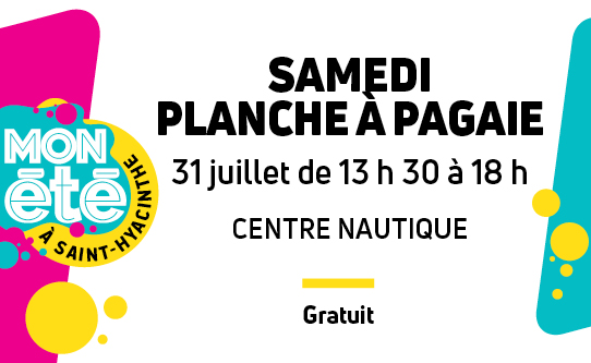 Dans le cadre de la programmation « Mon été à Saint-Hyacinthe », venez découvrir gratuitement la planche à pagaie (SUP), ce samedi 31 juillet, de 13 h 30 à 18 h, au centre nautique de Saint-Hyacinthe.