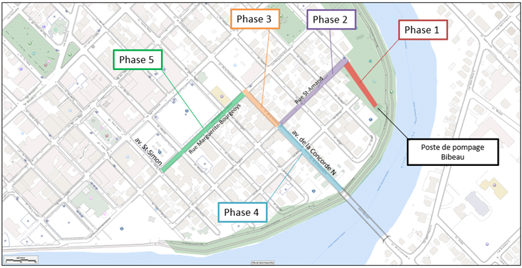Dès que les travaux seront complétés sur l’avenue de la Concorde Nord, ils se déplaceront sur la rue Marguerite-Bourgeoys à partir de l’intersection avec l’avenue de la Concorde Nord, jusqu’à l’avenue Saint-Simon.